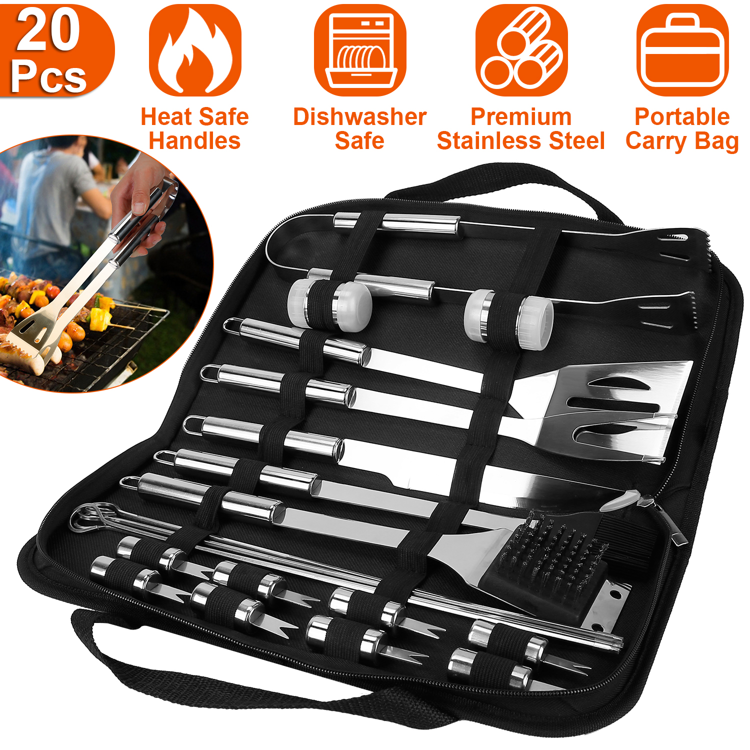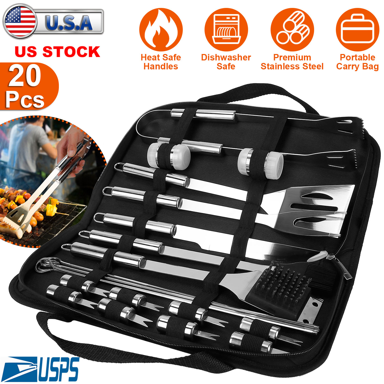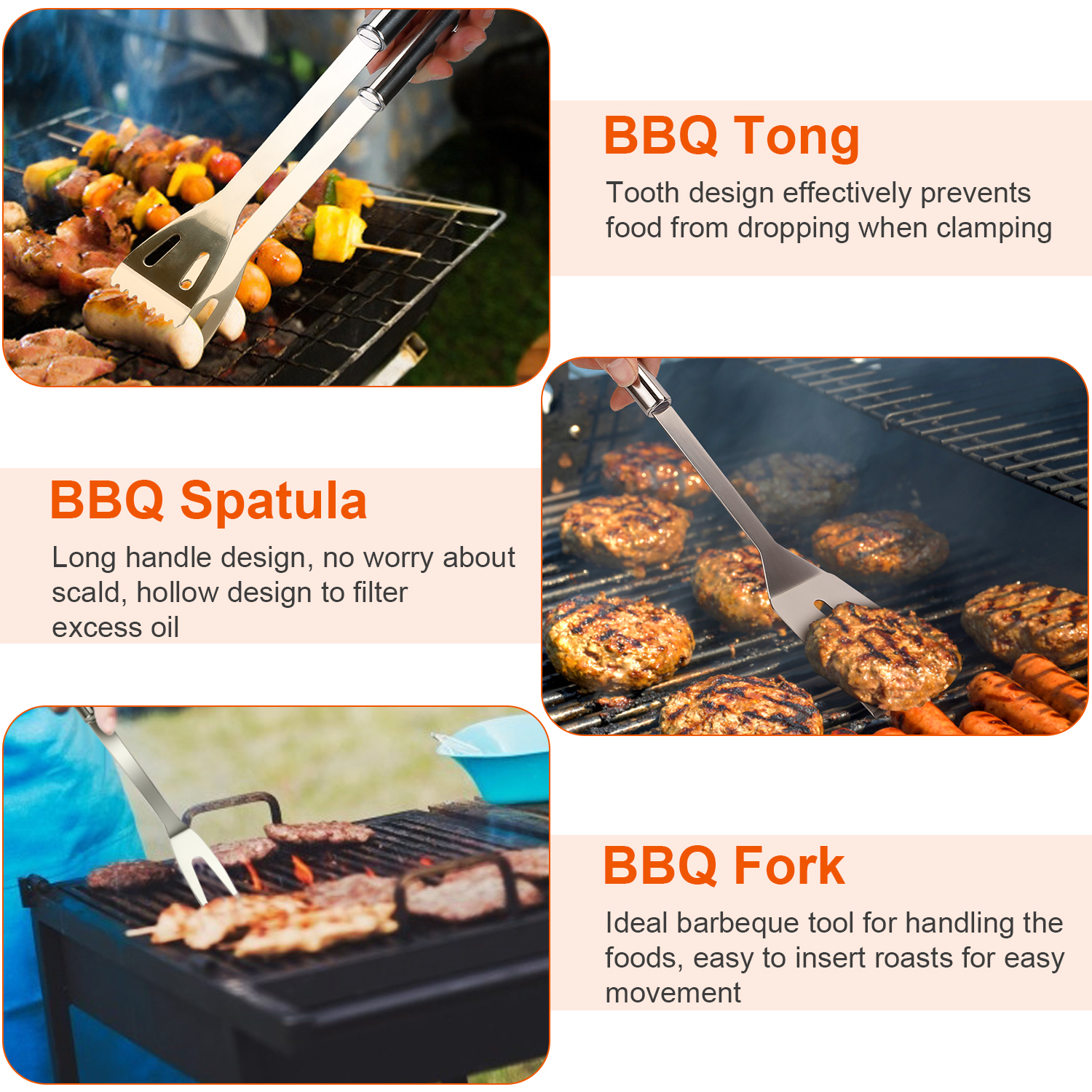 Stainless Steel BBQ Grill Tool Kit Grilling Utensil Accessories w/ Spatula Tongs Fork Knife Brush Pepper Salt Shaker Bottle Grilled Skewers Corn Need