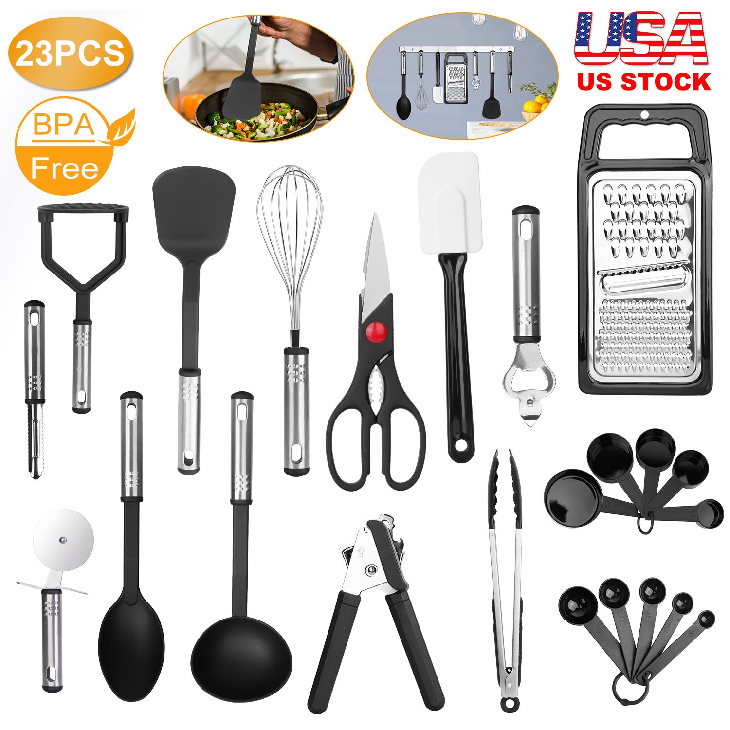 23Pcs Kitchen Utensil Set Stainless Steel Nylon Heat Resistant Cooking Utensil Tool Kit w/ Grater Scraper Tongs Whisk Can Bottle Opener Pizza Cutter V