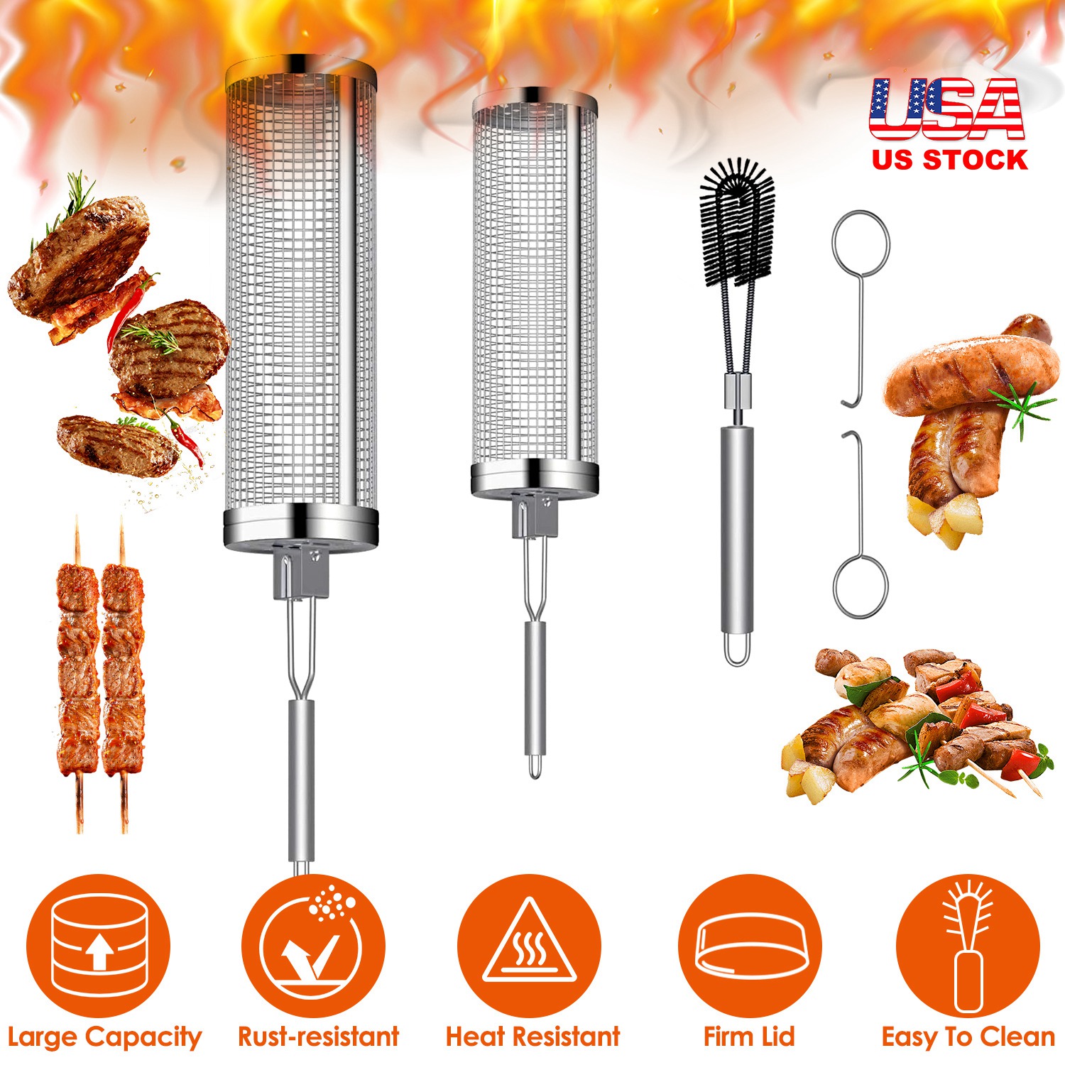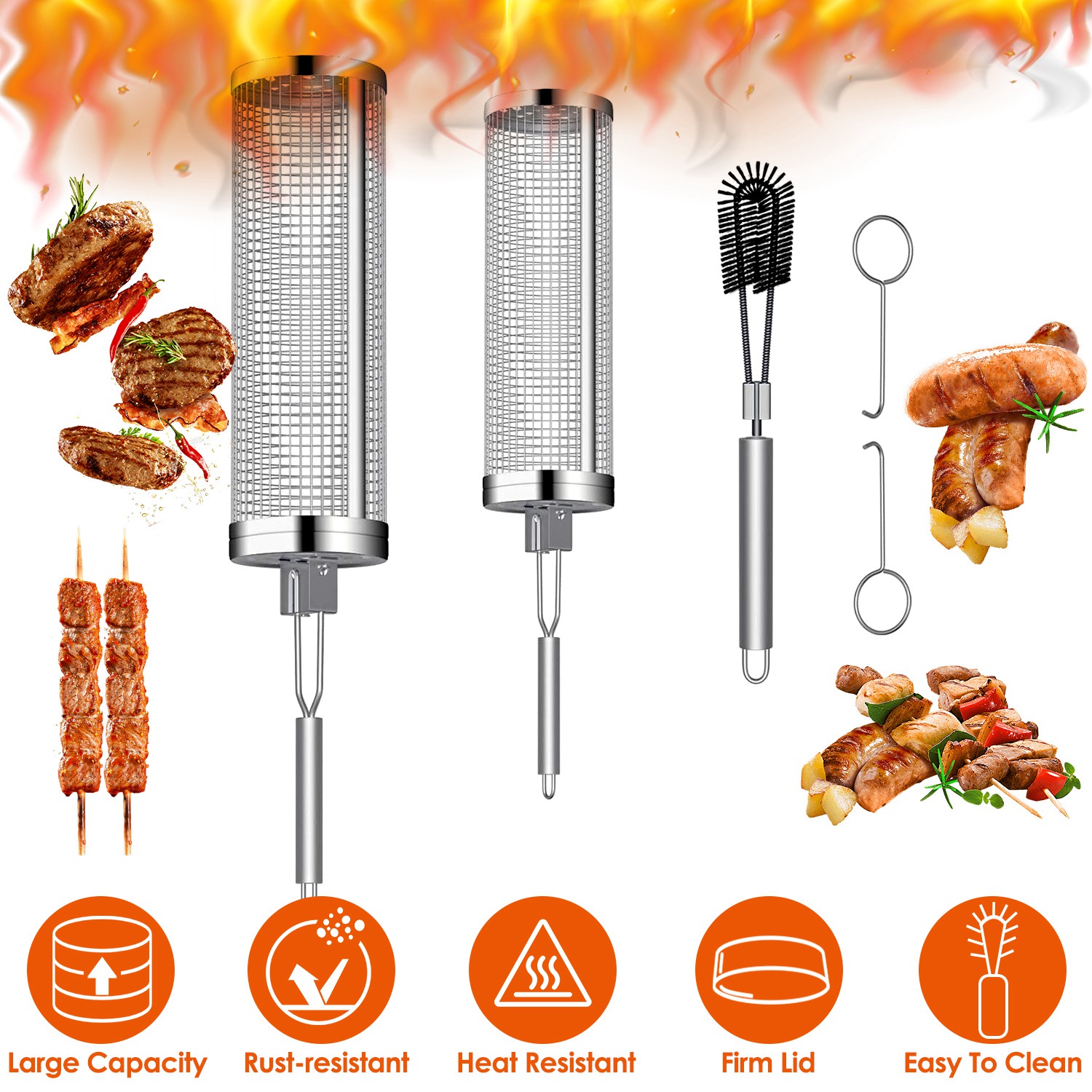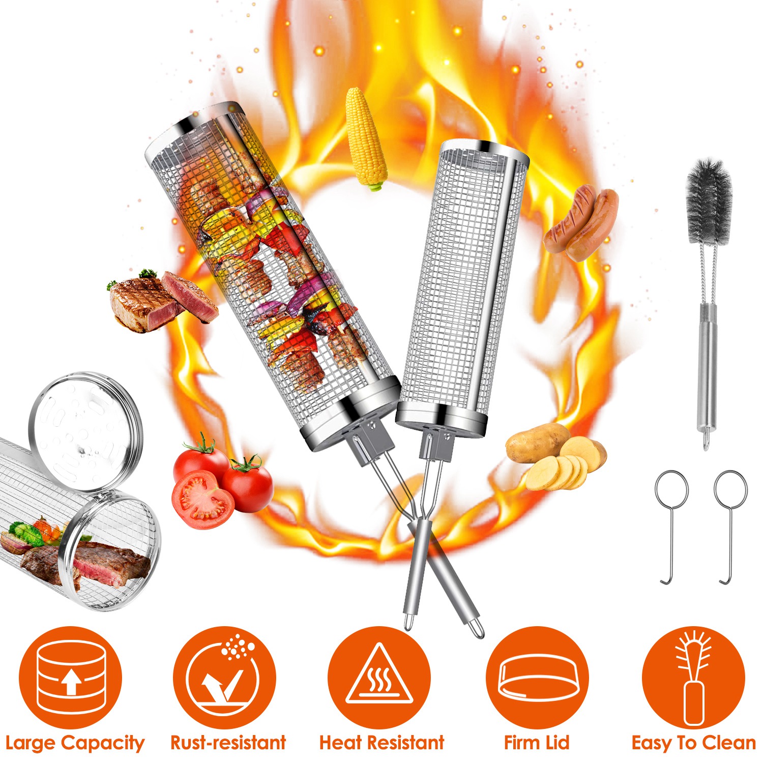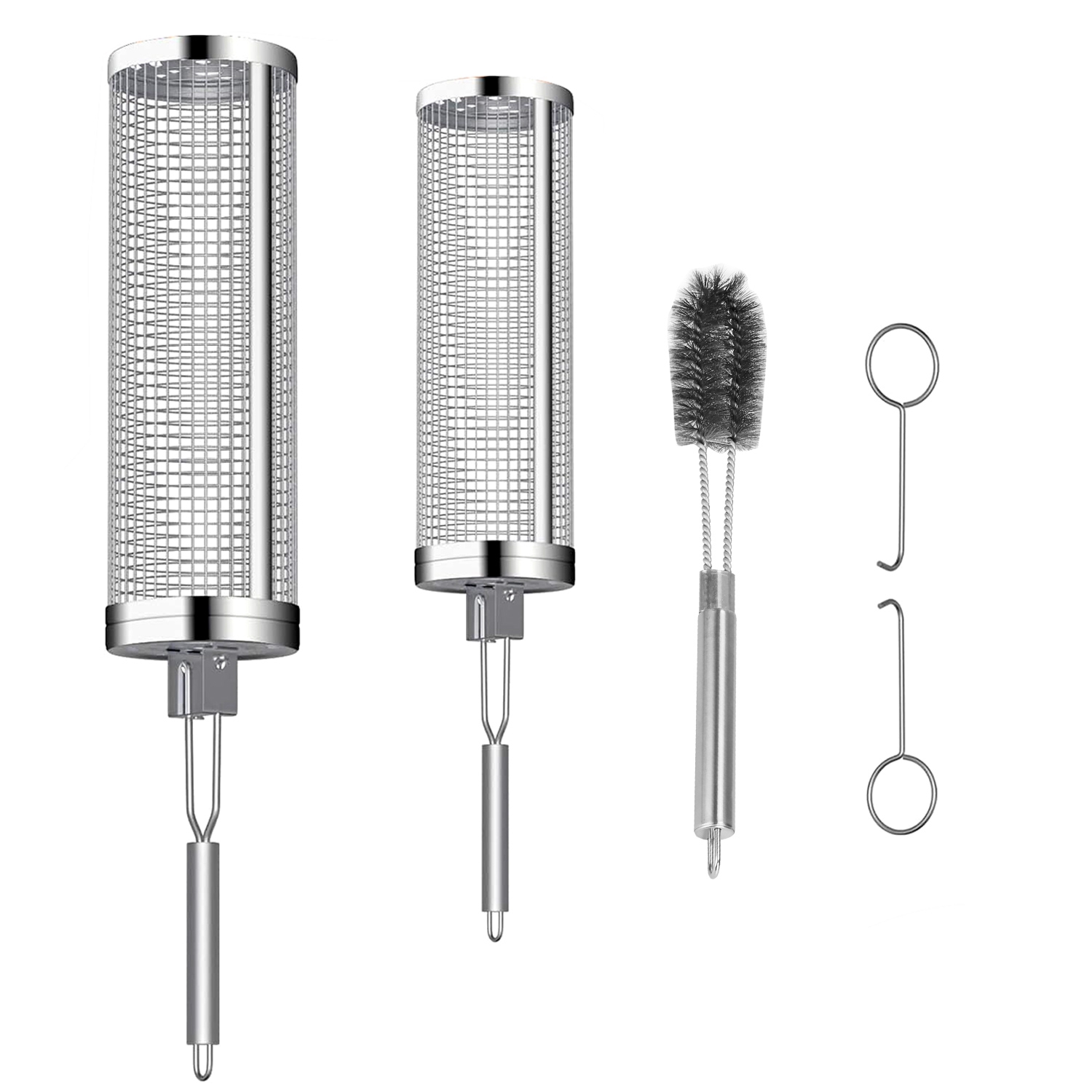 Home > 2Pack Rolling Grill Baskets BBQ Net Tubes Stainless Steel Barbecue Grill Grates with 2 Handles 2 Hooks Cleaning Brush for Vegetable Fish Meat Food Cam